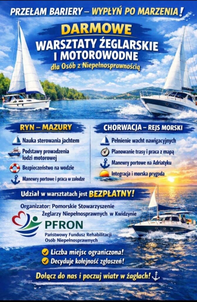 Zarząd Pomorskiego Stowarzyszenia Żeglarzy Niepełnosprawnych w Kwidzynie ogłasza nabór na warsztaty żeglarskie i motorowodne w Rynie oraz na warsztaty żeglarskie na morzu w Chorwacji.
