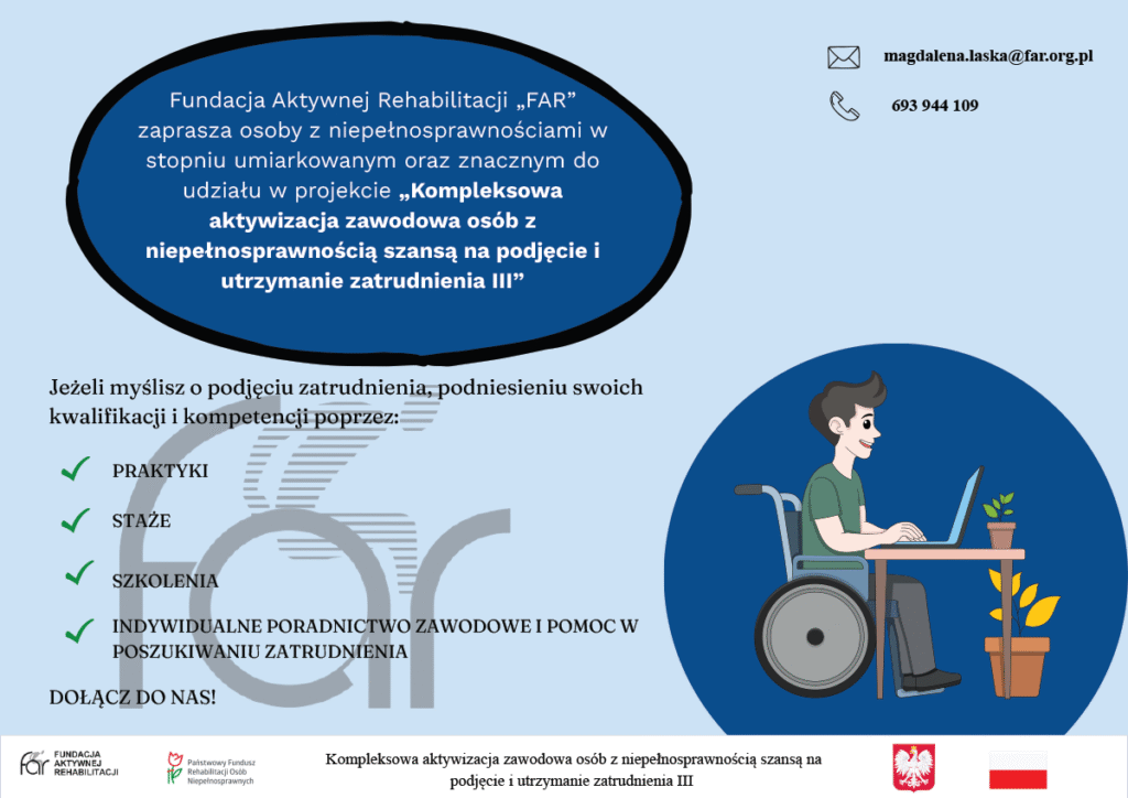 Zapraszamy  do udziału w projekcie „Kompleksowa aktywizacja zawodowa osób z niepełnosprawnością szansą na podjęcie i utrzymanie zatrudnienia III”. Projekt jest skierowany do osób z umiarkowanym oraz znacznym stopniem niepełnosprawności.